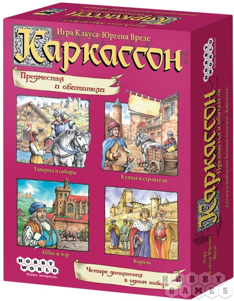 Набор "Предместья и обитетали" позволяет добавить в партию шестого соперника, увеличить количество земель, получить добавочные очки за размещение новых фишек. В это собрание расширений вошли "Таверны и соборы", "Купцы и строители", "Аббат и мэр",...
